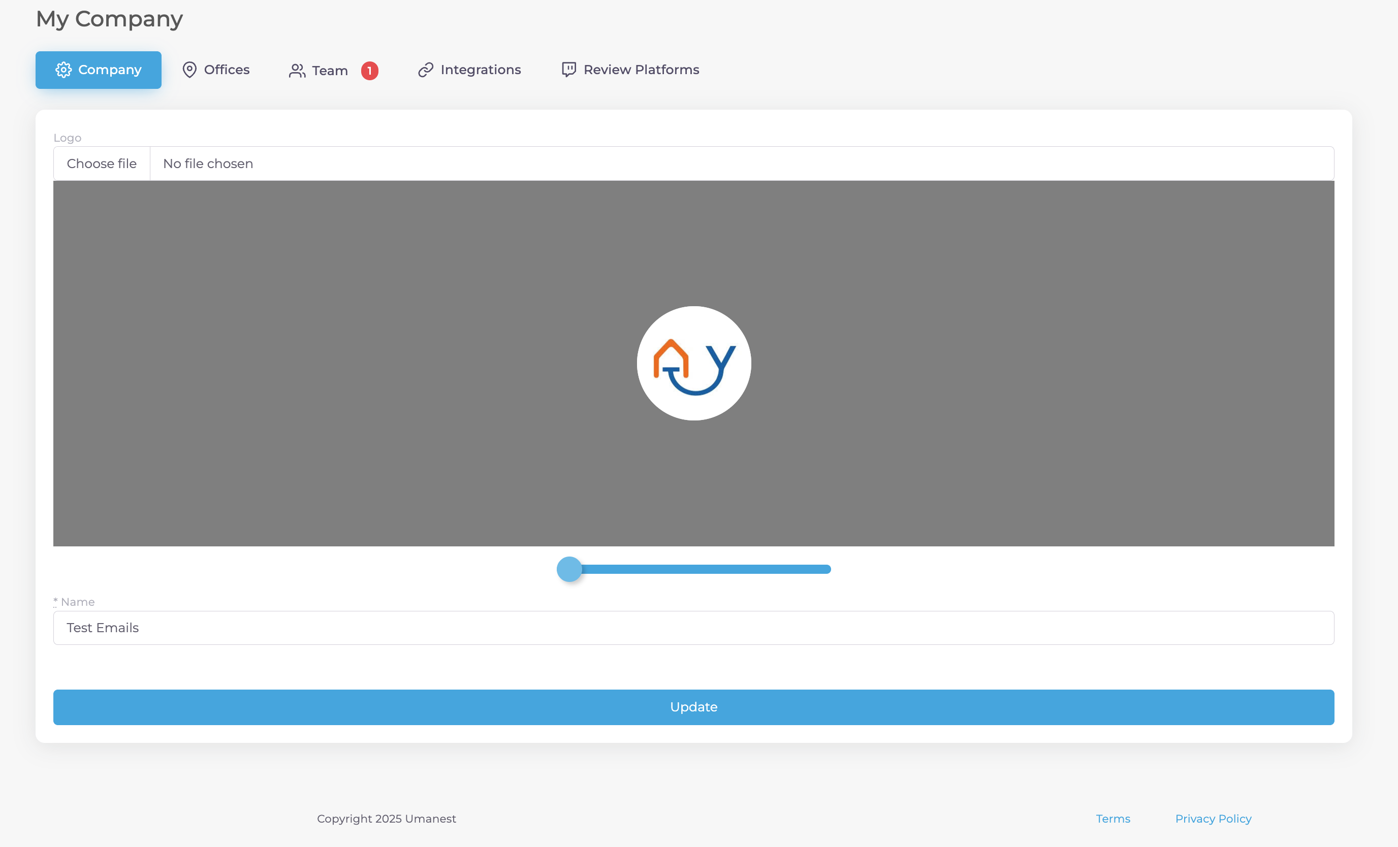 Your Company logo. This logo is used on communication made with your customers (emails and online surveys/forms) and across your multiple offices if applicable. You may also change the company name here.
