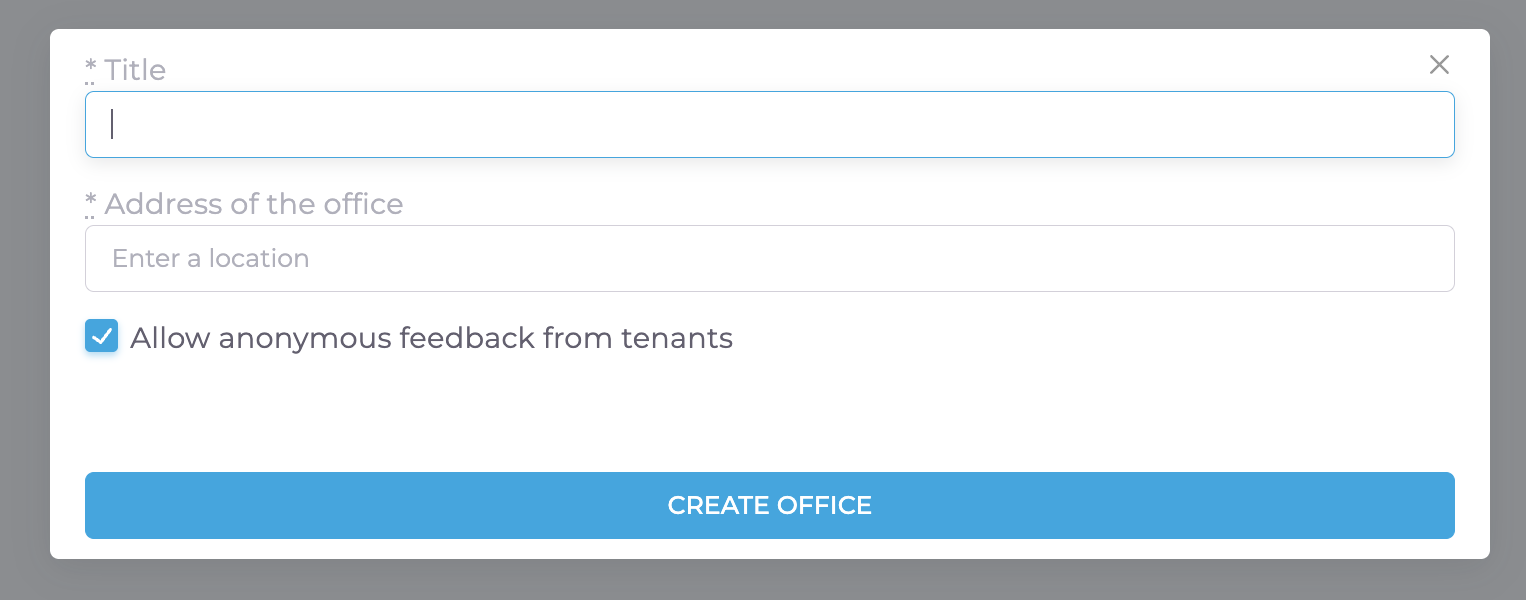 You can add new offices by clicking on the "+ Offices" where you are required to add the office name and address. You may also select if you wish for this office to allow anonymous feedback from Tenants.