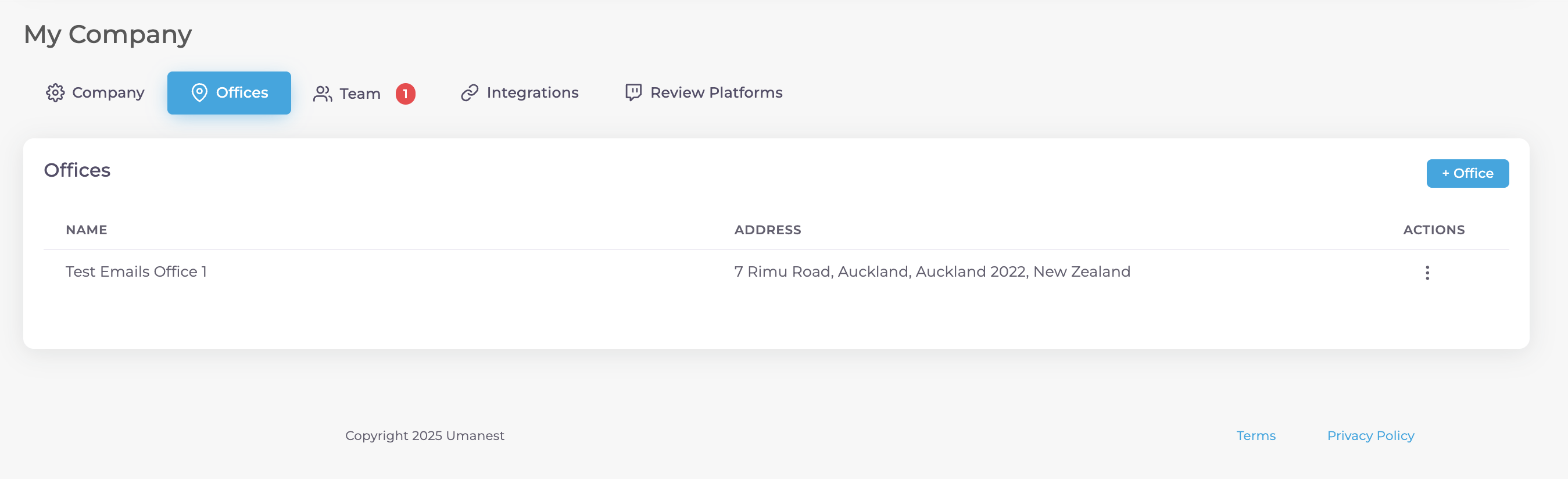 Via the "My Company" page, you can review and make changes to your company, office(s) and team members: