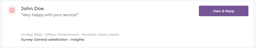 - Navigate to the Feedback page, locate the specific survey response you want to correct and click on the View & Reply button associated with that response.