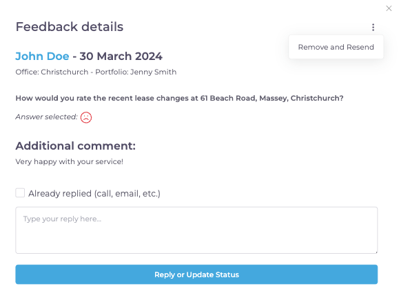 - Once in the detailed feedback view, click on the edit symbol (three dots) located at the top right corner and select Remove and Resend from the dropdown menu.