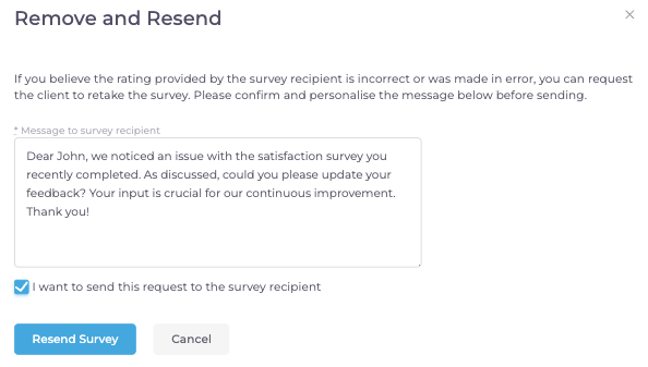 This allows you to rectify any mistaken survey responses easily. If a client has accidentally submitted an incorrect rating, you can now remove the original response and resend the survey for an updated rating.