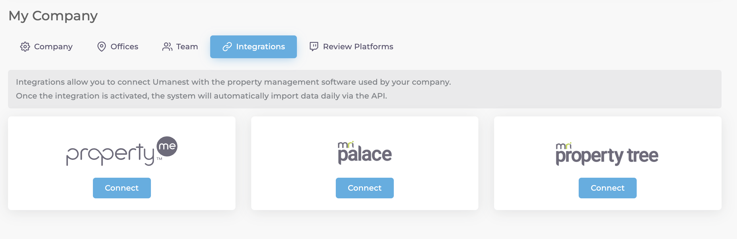 Integrations allow you to connect Umanest with the property management software used by your company. Once activated, the system will automatically import data daily via the API.