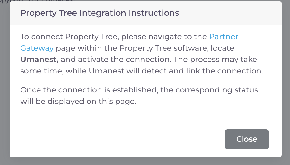 - Click Connect on PropertyTree. You can set up the integration by going to the Partner Gateway Page