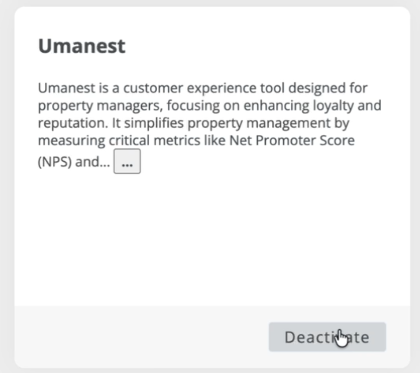 - Look for Umanest and Activate once you are able to find it. Once activated, PropertyTree will process the integration which may take some time before the connection is established.