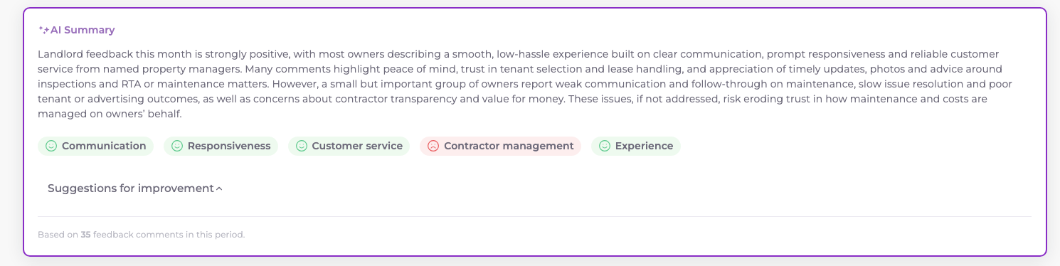 AI Insights analyses landlord and tenant ratings and written feedback to surface clear, actionable themes. By selecting a time frame and generating insights, users receive: