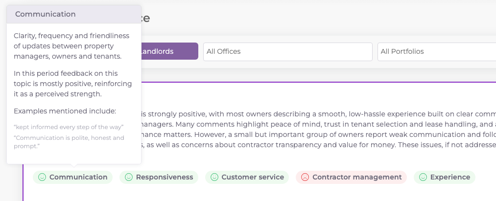 Hovering over the tags will give an explanation to help understand which themes are trending positive or negative. This will also give examples written by the Landlord or Tenants in that time period.