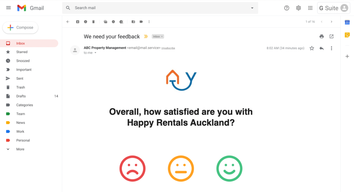 The user can complete the survey by simply hitting the smiley face matching their satisfaction level, directly within the email.